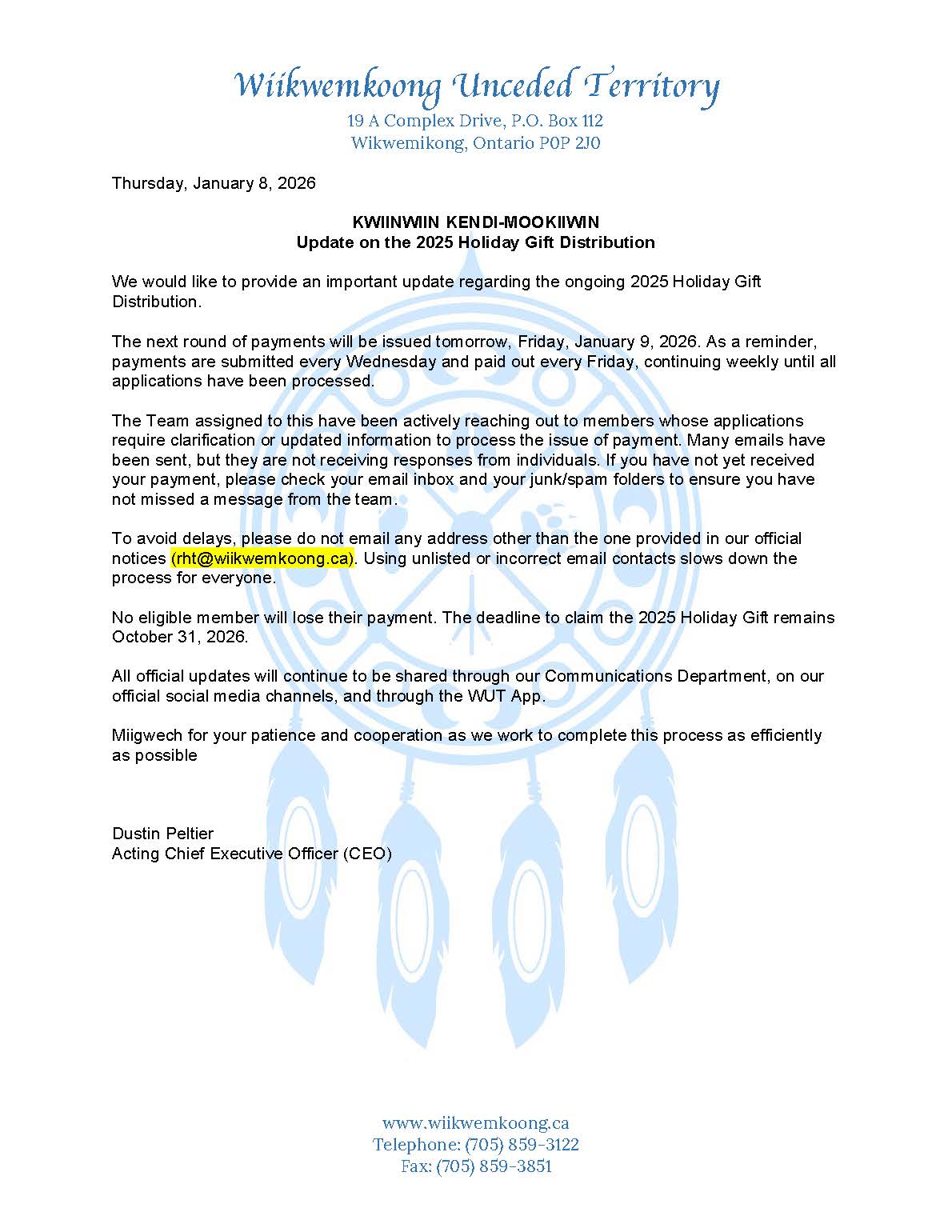 2025 Holiday Gift Update (Jan 8, 2026) 2026-01-08T16:32:47-04:00January 8th, 2026|News| Related Posts Wiikwemkoong Capital Planning Study (CPS) January 6th, 2026 | 0 Comments Junior School Closure Notice January 5th, 2026 | 0 Comments Annual Wiikwemkoong Christmas Telethon a Heartwarming Success December 22nd, 2025 | 0 Comments 2025 WUT Holiday Closure Notice December 22nd, 2025 | 0 Comments Update on the 2025 Holiday Gift Distribution December 17th, 2025 | 0 Comments