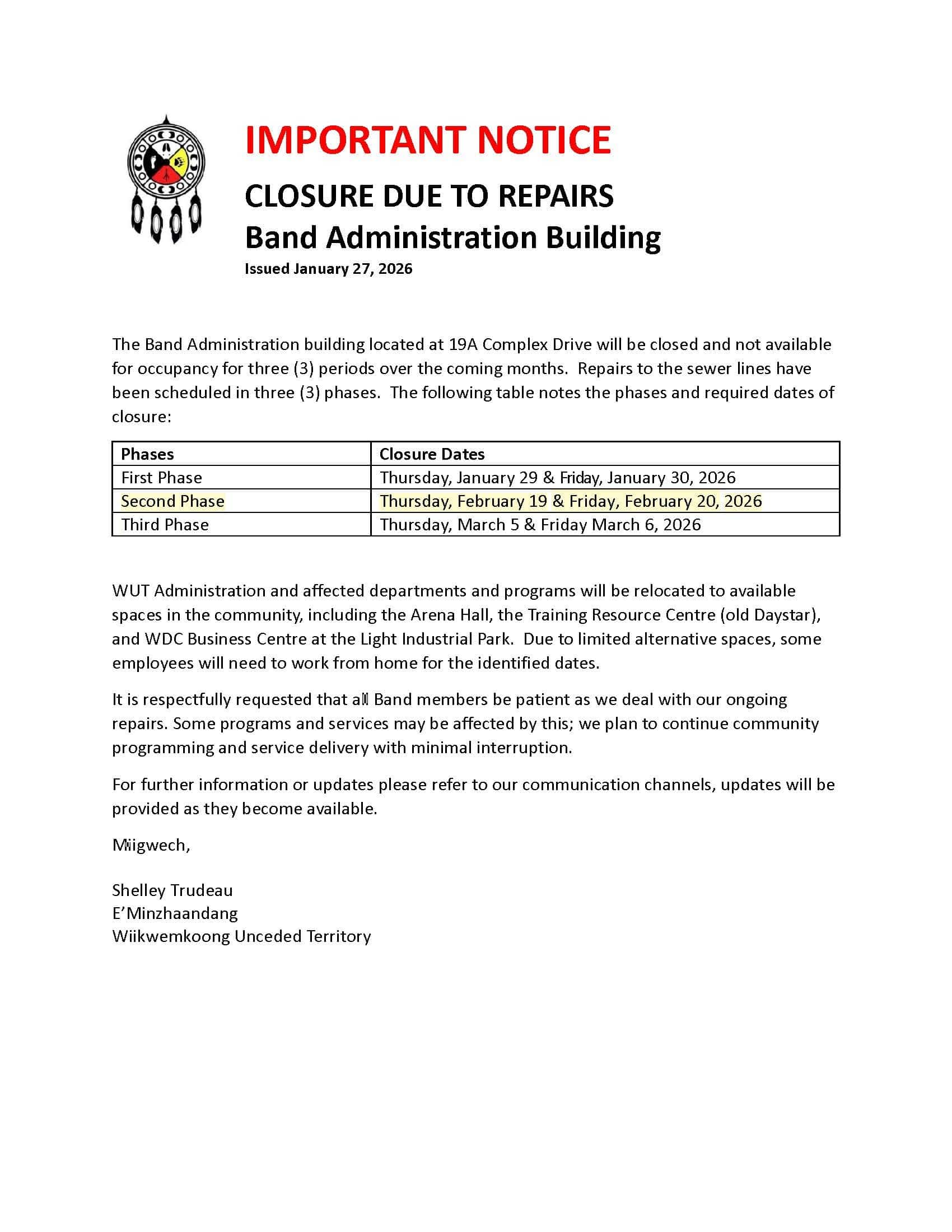 2ND PHASE CLOSURES 2026-02-17T16:51:52-04:00February 17th, 2026|News| Related Posts Judicial Review Application Filed Against Wiikwemkoong Unceded Territory Chief and Council April 2nd, 2026 | 0 Comments WUT OPERATIONS CLOSURE (March 16, 2026) March 15th, 2026 | 0 Comments POTENTIAL HYDRO OUTAGE NOTICE March 11th, 2026 | 0 Comments Notice from DLNR/Oil and Gas Program February 27th, 2026 | 0 Comments Notice of Road Closure Due to Water Service Line February 26th, 2026 | 0 Comments