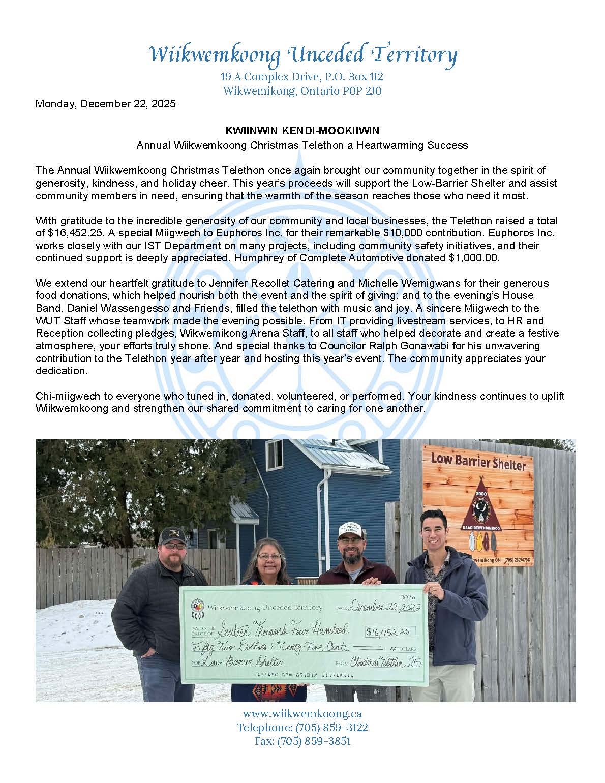 Annual Wiikwemkoong Christmas Telethon a Heartwarming Success 2026-01-14T14:29:42-04:00December 22nd, 2025|News| Related Posts Band Council Meetings Moving from Zoom to Microsoft Teams (Teams) February 9th, 2026 | 0 Comments Feb 9, 2026 Update: Water Main Break February 9th, 2026 | 0 Comments Feb 8, 2026 Update: Water Main Break February 8th, 2026 | 0 Comments Feb 7, 2026 Update: Water Main Break February 7th, 2026 | 0 Comments Feb 6, 2026 Update: Water Main Break February 6th, 2026 | 0 Comments