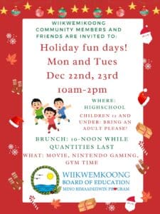 Holiday Fun Days- WBE 2025-12-16T11:50:33-04:00December 16th, 2025|News| Related Posts Update on the 2025 Holiday Gift Distribution December 17th, 2025 | 0 Comments Wiikwemkoong Christmas Telethon December 17th, 2025 | 0 Comments Transportation for the Winter Solstice Four Day Sacred Fire December 16th, 2025 | 0 Comments New Year’s Eve Pow Wow December 16th, 2025 | 0 Comments 13 Moon Teachings | Mnidoo Giisoonhs December 16th, 2025 | 0 Comments
